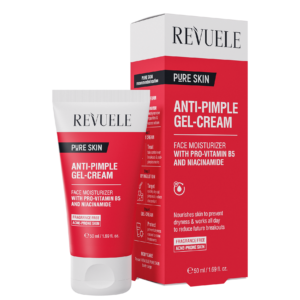 REVUELE ГЕЛЬ-КРЕМ ПРОТИВ ПРЫЩЕЙ Объем: 50 мл.REVUELE ANTI-PIMPLE GEL-CREAM — это мощный ежедневный увлажняющий крем, предназначенный для жирной и комбинированной кожи, склонной к акне. Благодаря провитамину B5 и ниацинамиду он удерживает влагу в коже и предотвращает сухость, вызванную лечением акне. Легкая, но эффективная формула заметно уменьшает высыпания и недостатки, разглаживает кожу и выравнивает тон, не закупоривая поры.