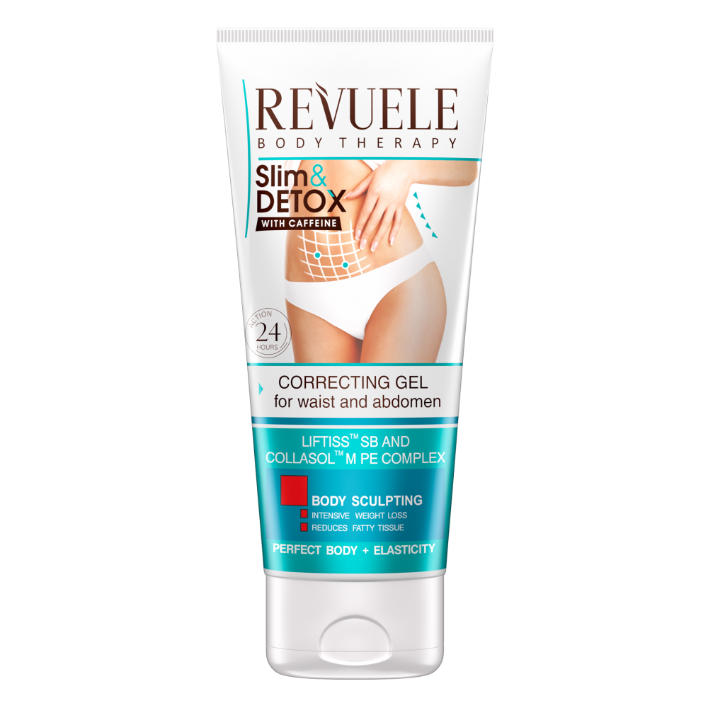 REVUELE SLIM & DETOX WITH CAFFEINE Корректирующий гель для талии и живота Объем: 200 млКорректирующий гель для талии и живота, обогащенный кофеином, Liftliss Complex™ и Collasol Complex™, повышает эластичность кожи, делая проблемную зону более упругой, придавая ей форму и подтягивая ее.
