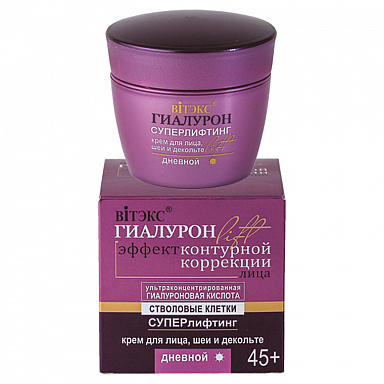 Суперлифтинг дневной крем для лица, шеи и декольтеДневной крем для лица, шеи и декольте vitex- витэкс гиалурон lift обеспечивает упругость, лифтинг-эффект и интенсивное увлажнение на весь день. Формула с гиалуроновой кислотой, омолаживающим комплексом и натуральными экстрактами разглаживает морщины, улучшает эластичность и защищает кожу от внешних факторов. Средство разработано специалистами витекс косметика для ухода за зрелой кожей, нуждающейся в поддержке и восстановлении. Крем входит в популярную серию витэкс, сочетающую эффективность, лёгкую текстуру и комфорт. Объём 50 мл.