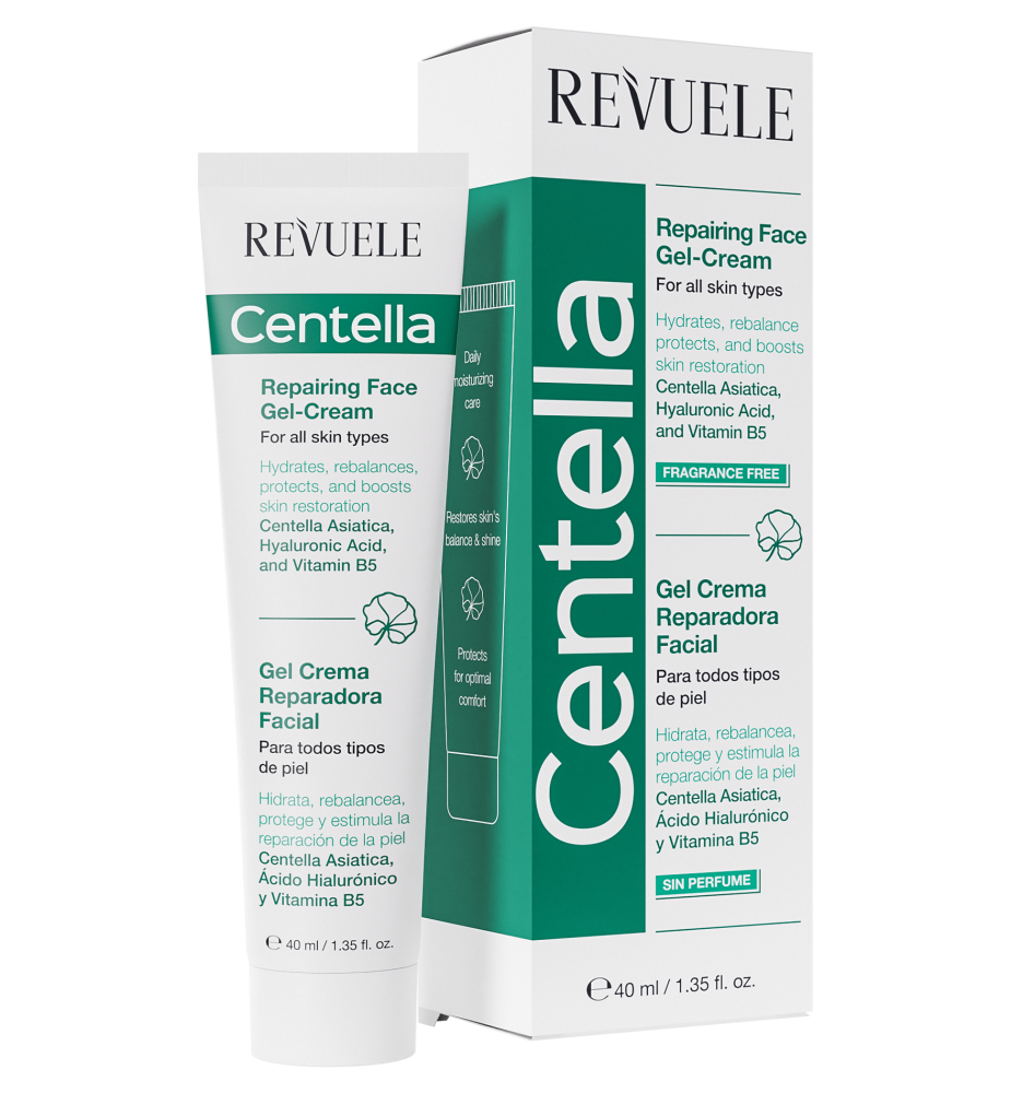 REVUELE CENTELLA REPAIRING FACE GEL-CREAM — это ультралегкий восстанавливающий ежедневный уход для лица для всех типов кожи с тусклым цветом лица, признаками усталости и тонкими морщинами. Многофункциональная формула с CICA (центелла азиатская), гиалуроновой кислотой и витамином B5 мгновенно увлажняет кожу и работает в течение дня, защищая и поддерживая ее регенерацию. Он помогает восстановить баланс и эластичность кожи, делая ее более упругой, здоровой и молодой.