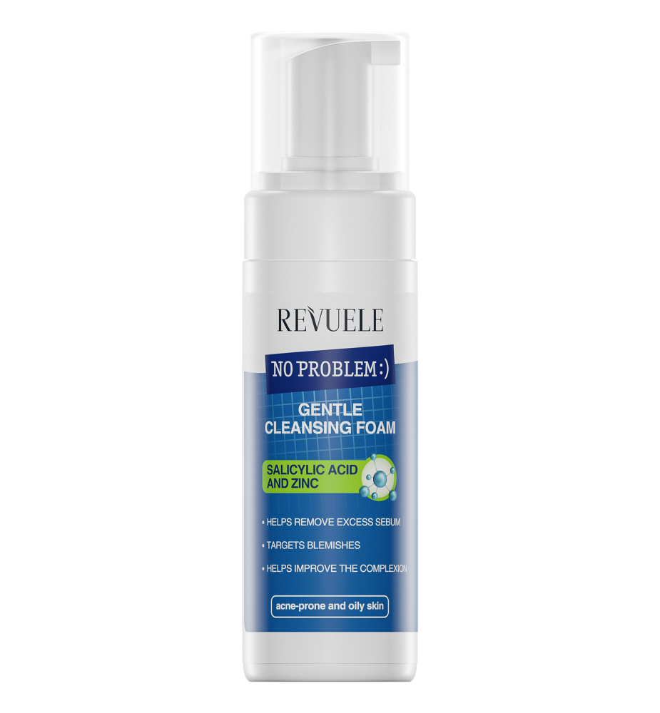 REVUELE NO PROBLEM НЕЖНАЯ ОЧИЩАЮЩАЯ ПЕНКА С САЛИЦИЛОВОЙ КИСЛОТОЙ И ЦИНКОМ Объем: 150 мл.REVUELE NO PROBLEM GENTLE CLEANSING FOAM САЛИЦИЛОВАЯ КИСЛОТА И ЦИНК Этот мягкий продукт очищает склонную к акне кожу от жира, грязи и остатков макияжа, не вызывая раздражения. Он работает, чтобы сбалансировать чрезмерную жирность и глубоко очистить поры, обеспечивая свежую кожу без жирного блеска. Разработанный для склонной к акне и жирной кожи, он подходит для частого использования.