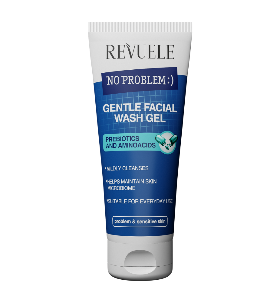 REVUELE NO PROBLEM GENTLE FACIAL WASH GEL ПРЕБИОТИКИ И АМИНОКИСЛОТЫ Этот нежный гель удаляет грязь, жир и остатки макияжа с лица, сохраняя естественный гидробаланс кожи. Результат — более чистая, здоровая кожа с уменьшенными признаками раздражения и высыпаний. Разработанный для проблемной и чувствительной кожи, он подходит для ежедневного использования.