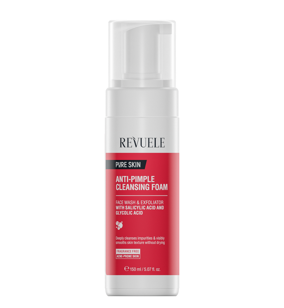 REVUELE ОЧИЩАЮЩАЯ ПЕНКА ПРОТИВ ПРЫЩЕЙ Объем: 150 мл.REVUELE ANTI-PIMPLE CLEANSING FOAM — это активное средство для умывания и отшелушивания, предназначенное для жирной и комбинированной кожи, склонной к акне. Усовершенствованная формула с салициловой и гликолевой кислотами очищает от загрязнений и избытка кожного сала, одновременно подсушивая прыщи, поддерживая обновление клеток и сужая поры. Пена заметно сглаживает неровную текстуру кожи, не раздражая и не высушивая ее.