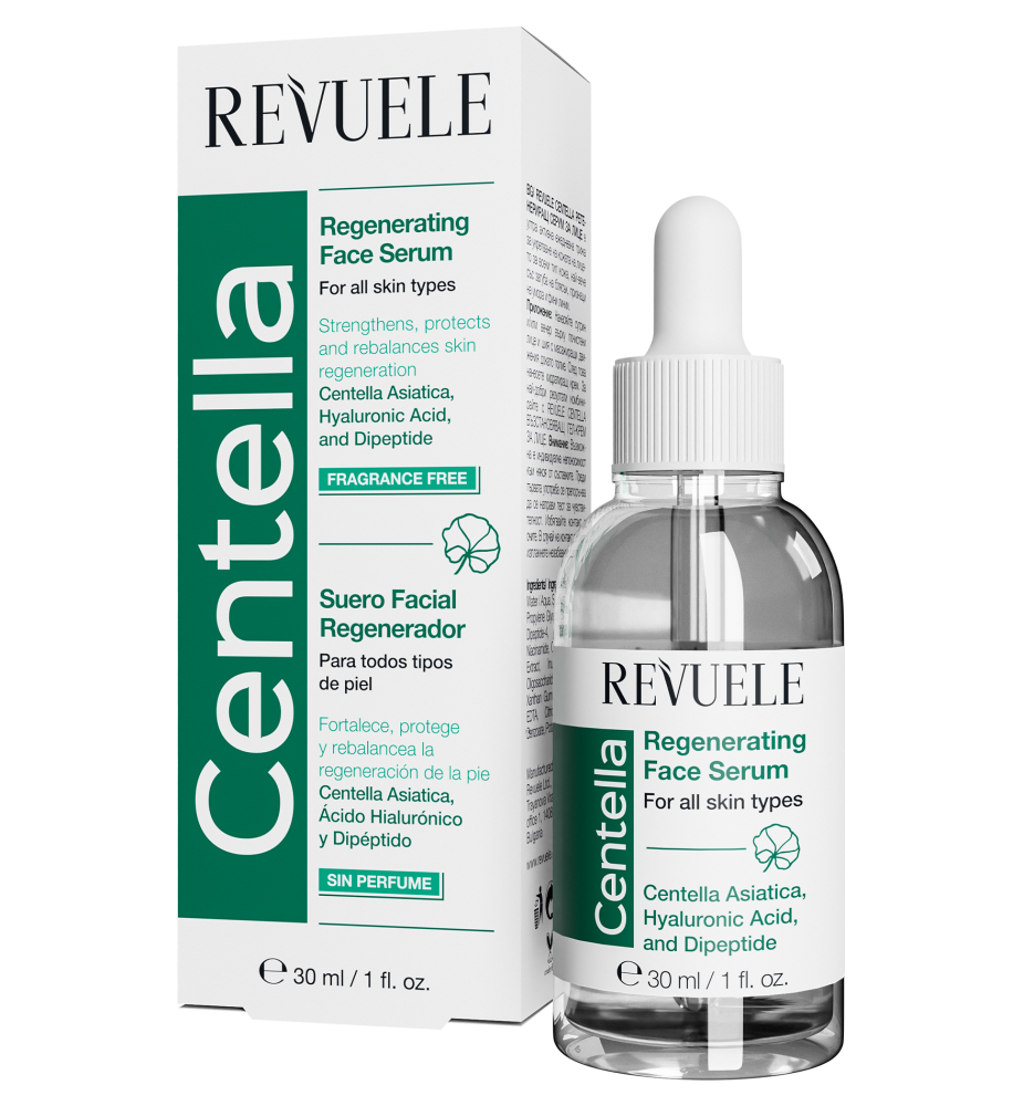 REVUELE РЕГЕНЕРИРУЮЩАЯ СЫВОРОТКА ДЛЯ ЛИЦА CENTELLA Объем: 30млREVUELE CENTELLA REGENERATING FACE SERUM — это ультраактивный укрепляющий кожу ежедневный уход для всех типов кожи с тусклым цветом лица, признаками усталости и тонкими морщинами. Богатая формула с CICA (Centella Asiatica) и гиалуроновой кислотой глубоко увлажняет кожу и усиливает ее восстанавливающую функцию. Дипептидный настой стимулирует регенерацию кожи и помогает защитить ее от преждевременного старения. Сыворотка выравнивает цвет лица, восстанавливает сияние и эластичность кожи.