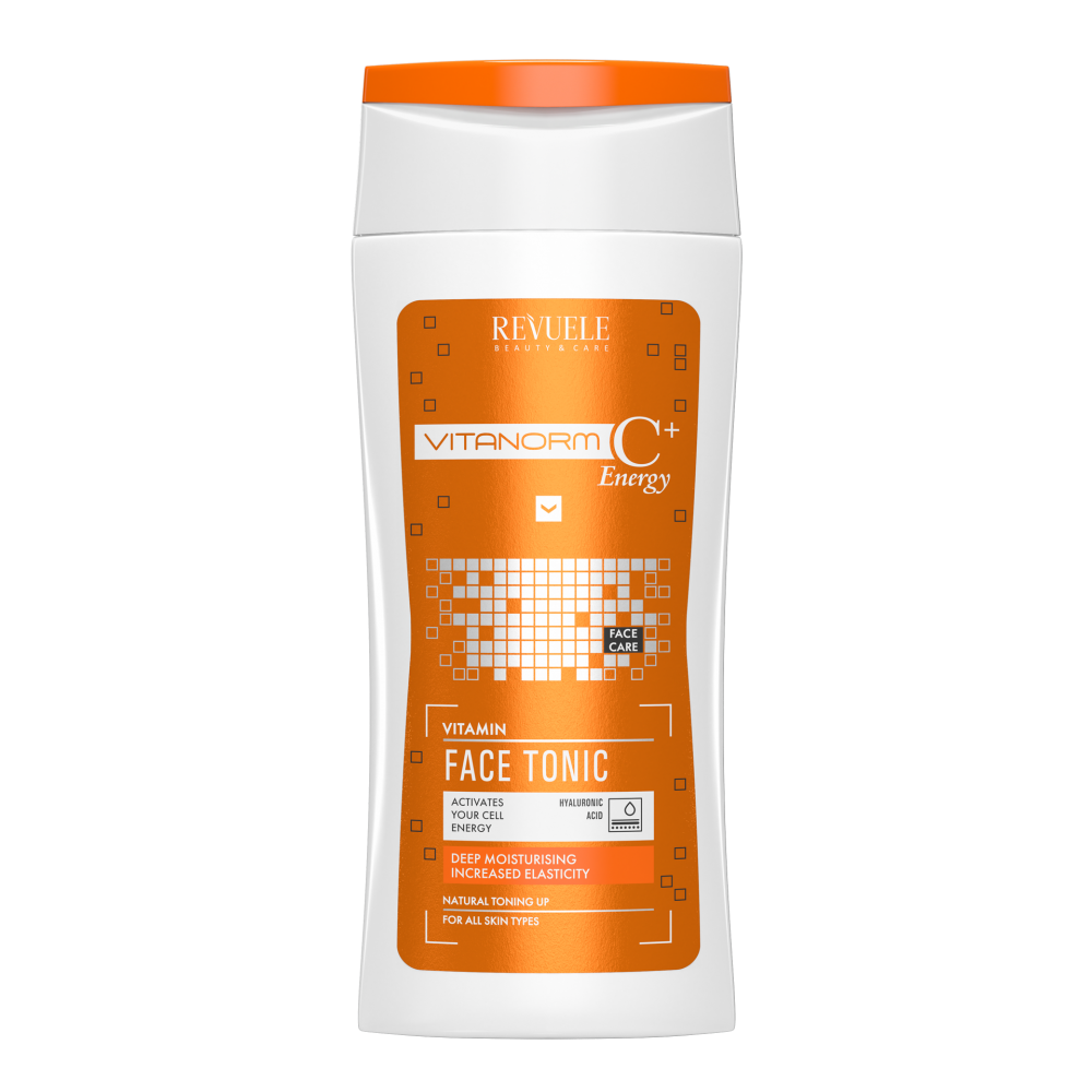 REVUELE VITANORM C+ENERGY Тоник для лица с витаминами Объем: 200 млЭтот нежный тоник успокаивает, удаляет остатки загрязнений, сужает поры, освежает кожу лица и делает ее матовой. После основного очищения он прекрасно увлажняет и питает кожу, восстанавливает ее эластичную структуру. Гиалуроновая кислота в составе средства поддерживает нормальный водный баланс в клетках кожи, образует защитную пленку на ее поверхности, удерживает и препятствует испарению влаги, уменьшает глубину морщин. Мощный природный антиоксидант витамин С обладает тонизирующими свойствами и прекрасно поддерживает тканевой иммунитет, активизирует защитные функции кожи. Этот компонент способствует замедлению процессов старения, усиливает синтез коллагена, усиливает антиоксидантную защиту, подавляет выработку меланина, предотвращает образование пигментных пятен и выравнивает тон кожи. Пантенол проникает в нижние слои кожи, впитывается в клетки кожи, улучшает ее увлажнение, снимает зуд.