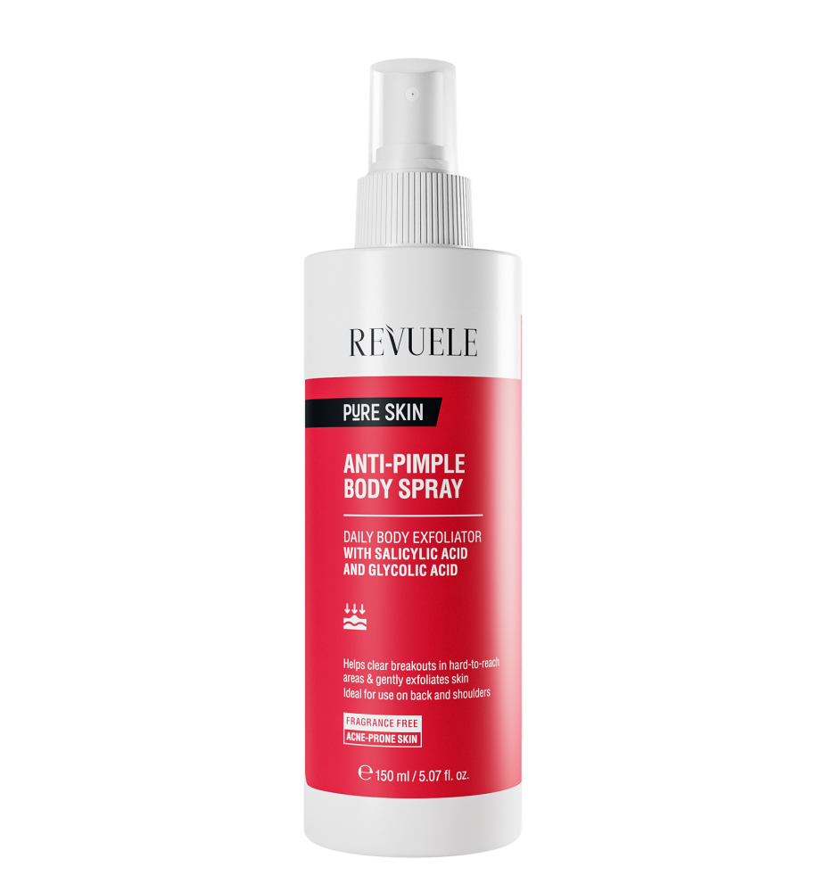 REVUELE СПРЕЙ ДЛЯ ТЕЛА ОТ ПРЫЩЕЙ Объем: 150 млREVUELE ANTI-PIMPLE BODY SPRAY — это простое в использовании отшелушивающее средство, предназначенное для жирной и комбинированной кожи, склонной к акне. Активная формула с салициловой и гликолевой кислотами устраняет неровности, прыщи и черные точки в труднодоступных местах тела, таких как спина. Спрей помогает заметно уменьшить размер пор, минимизировать высыпания и предотвратить их дальнейшее появление.