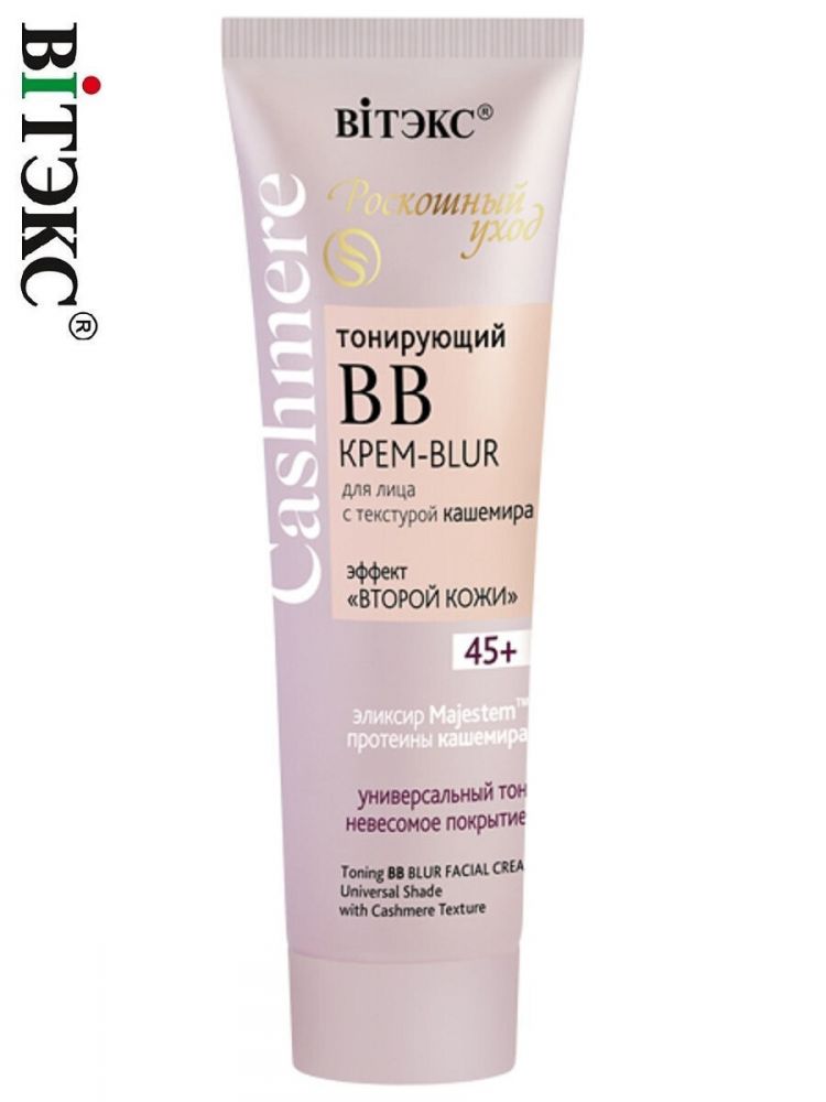 Тонирующий ВВ КРЕМ-BLUR для лица с текстурой кашемира 45+ВВ крем-BLUR для лица Витэкс Vitex Cashmere, 30 мл. Универсальный тон, эффект «второй кожи» и BLUR-фильтра в одном флаконе. Обеспечивает идеальное ровное покрытие без эффекта маски, визуально стирает поры и неровности. Лёгкая невесомая текстура дарит коже бархатистость, комфорт, лифтинг и ухоженный вид. Маскирует несовершенства, повышает упругость и выравнивает тон лица.